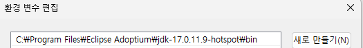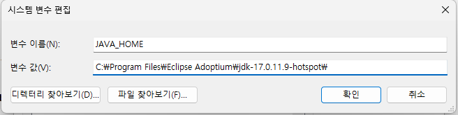 JAVA_HOME - 'PATH' 변수에 'JAVA_HOME/bin' 경로를 추가합니다. ( C:\Program Files\Eclipse Adoptium\jdk-17.0.11.9-hotspot\bin)