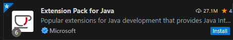 검색 창에 ' Java Extension Pack' 을 입력하고, Java 개발을 위해 Microsoft에서 제공하는 Java Extension Pack을 설치합니다.
