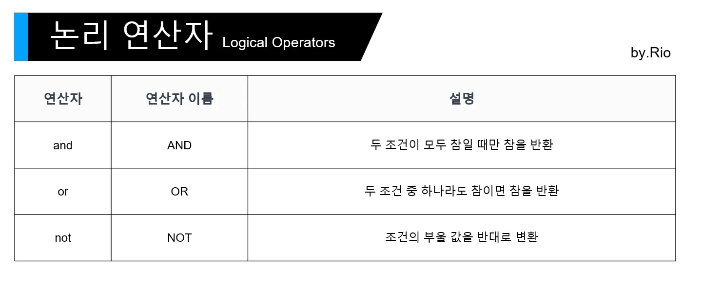 이번 포스팅에서는 파이썬 에서 쓰이는 논리 연산자 를 예제를 통해 정리해보도록 하겠습니다.